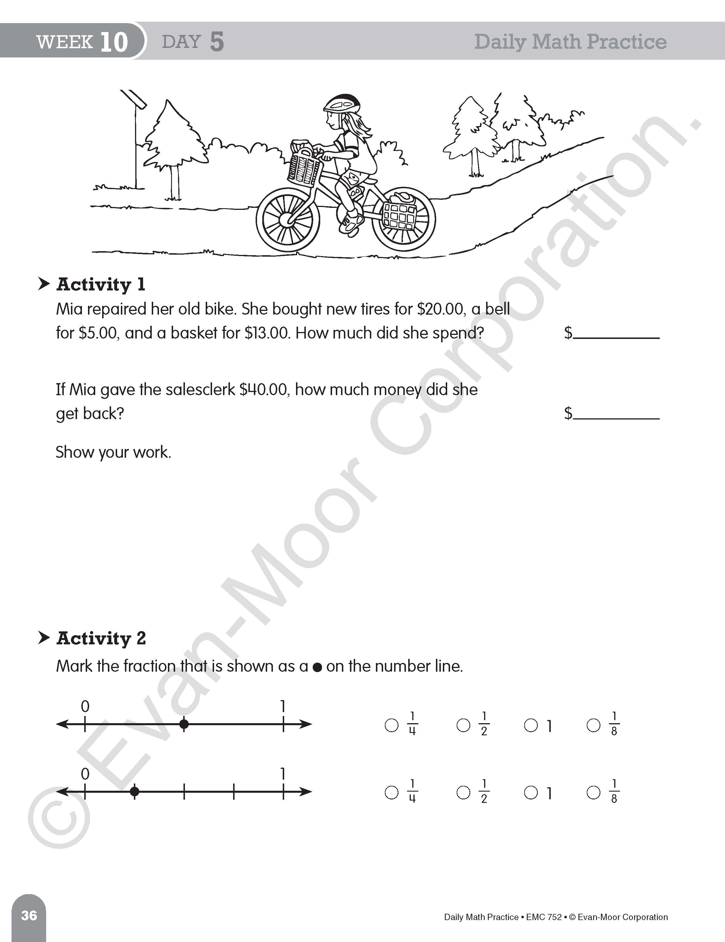 Students complete five short math problems on days 1-4. The day 5 activity provides more extensive practice and asks students to think critically.