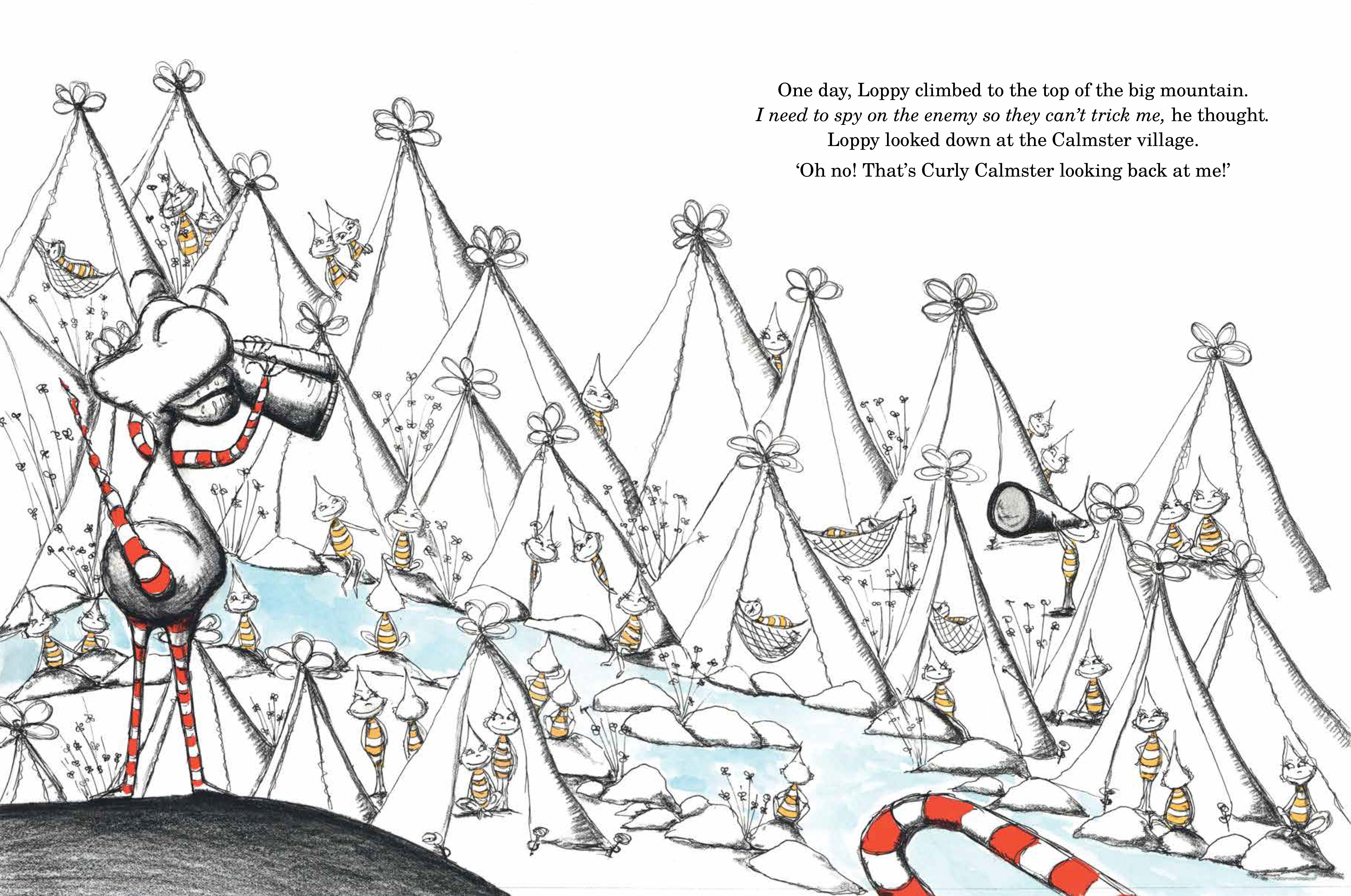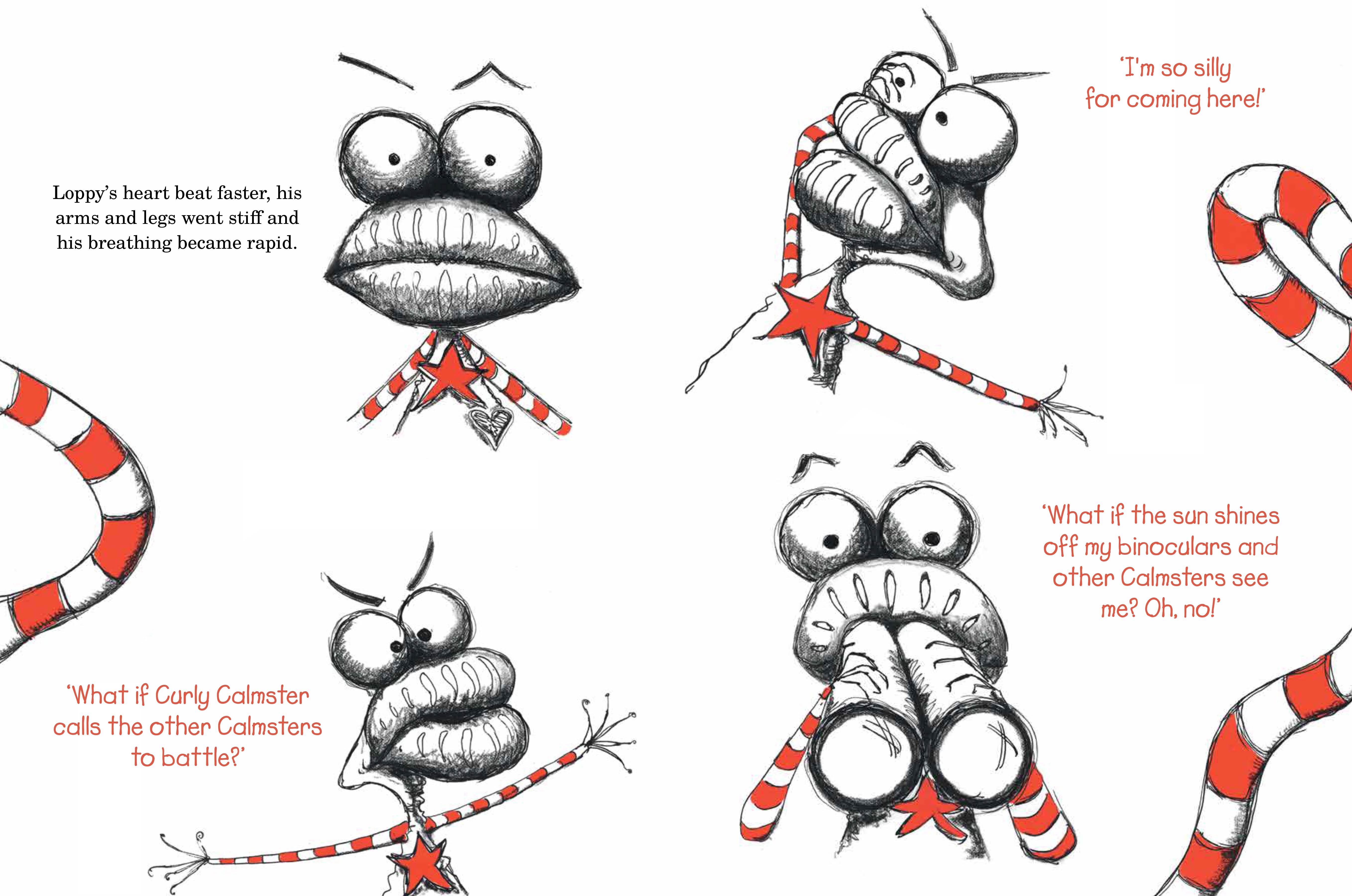 He always focuses his attention on what could go wrong and can't seem to stop worrying. Curly the Calmster is just the opposite, and gently encourages Loppy to think differently about his worries.