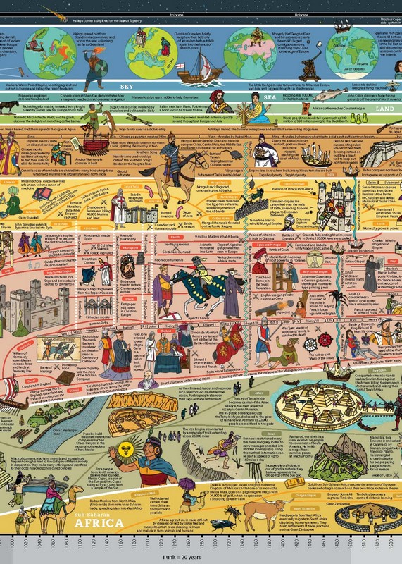 This timeline is uniquely broken out into 12 sections, including by subject areas (such as sea, land) and continents, as well as by date, with over 1,000 pictures and captions. From the rise of the dinosaur to the creation of the smart phone, the nearly six-foot-long timeline allows you to compare events across the world at any given moment in time.