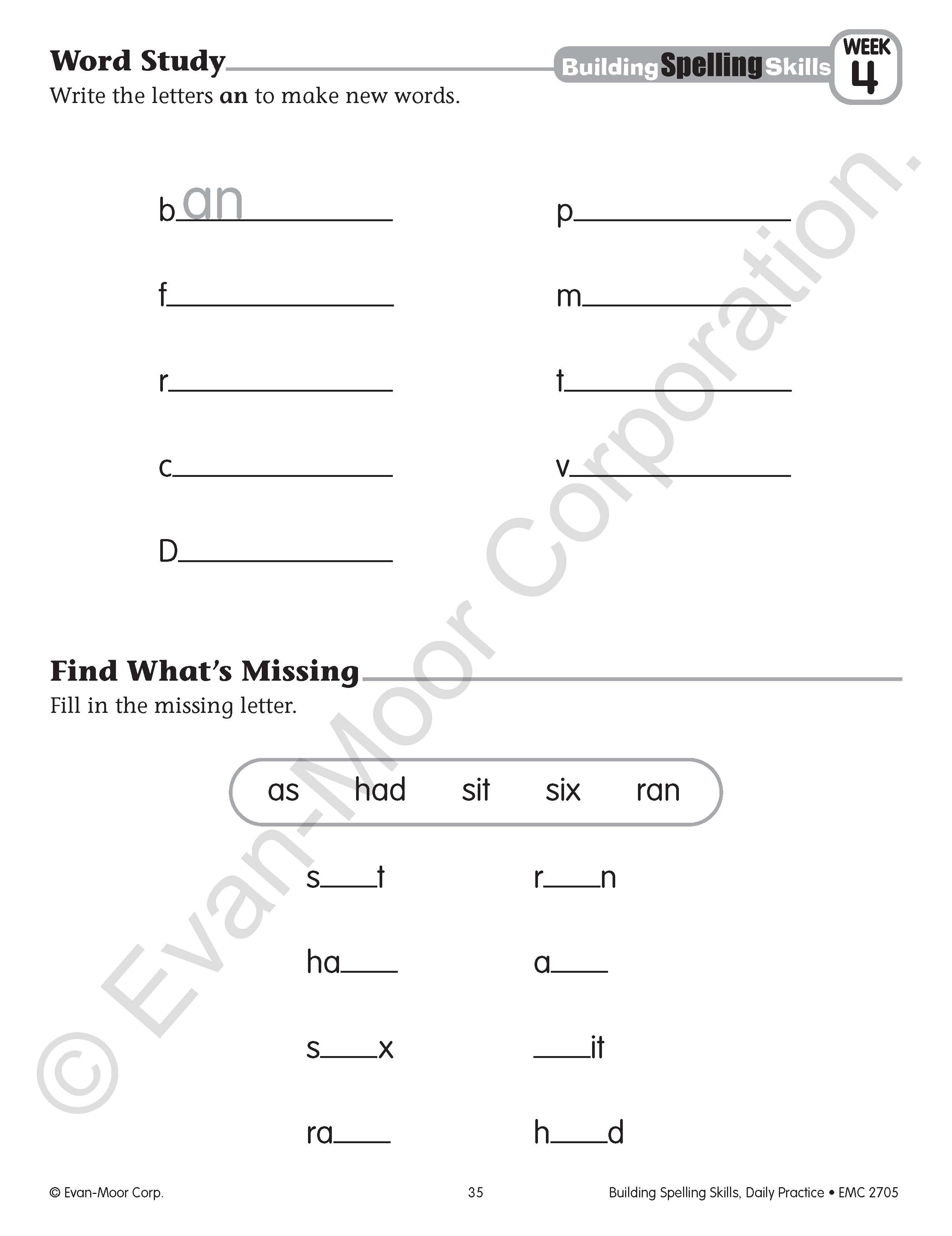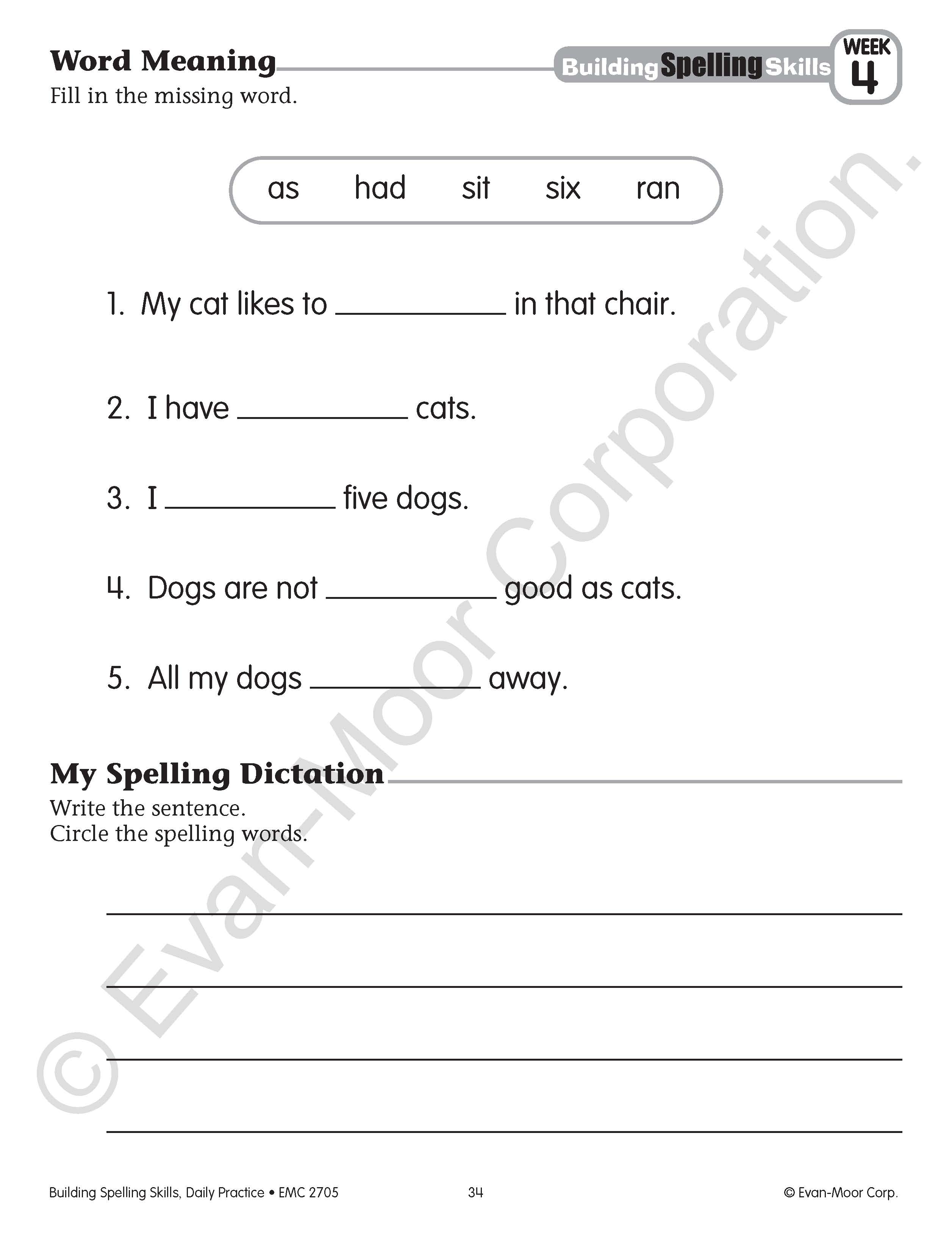 In Building Spelling SkillsDaily Practice, Grade 1, students will learn five spelling words per week in lists 1-14; then eight words per week in lists 15-30 (198 total). One or two sentences for dictation are provided for each list.
