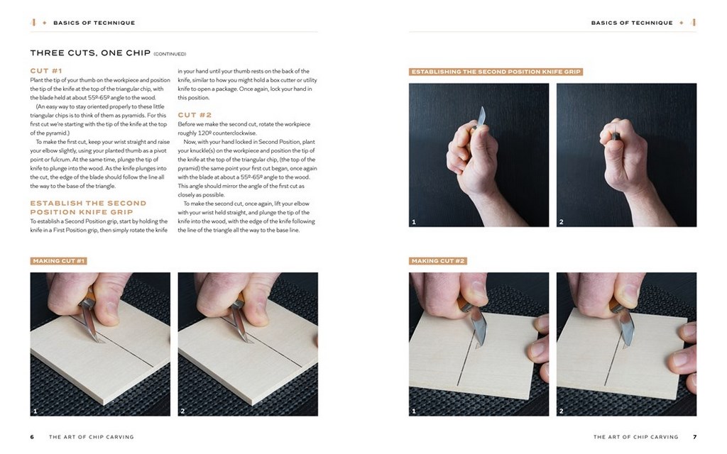 Anyone, from the completely inexperienced beginner to the veteran craftsperson, can learn to use simple, inexpensive tools and techniques to carve striking decorative designs in wood. Chip carving is an especially good introduction to working wood for the inexperienced because of its low cost-of-entry, and because it puts the most essential concepts of woodworking front and centre: safety, precision, and how understanding the nature of the wood itself leads to successful results.