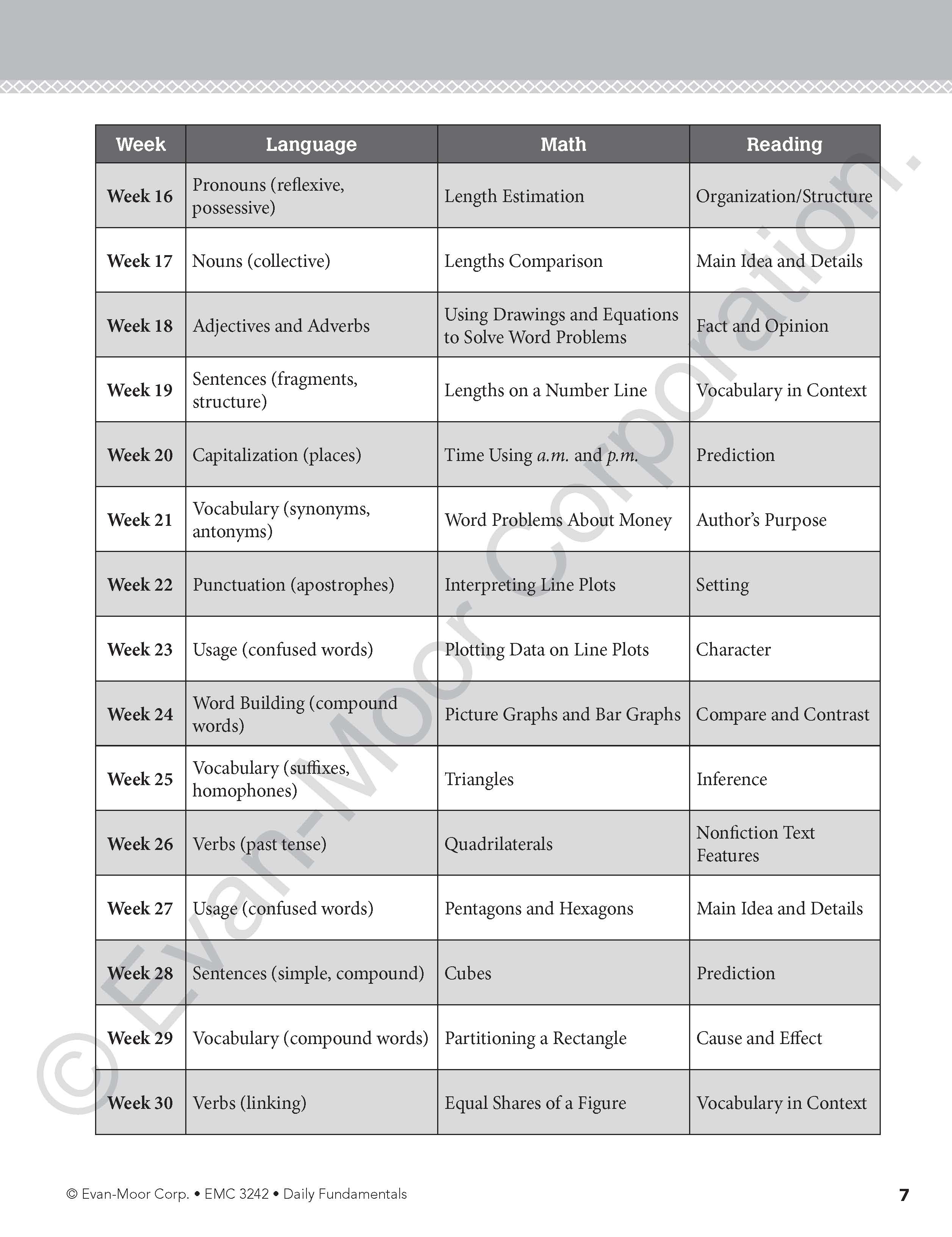 Monday-Friday: Full-page daily activities provide practice of grade-level language, math, and reading skills, focusing on one skill in each subject area.