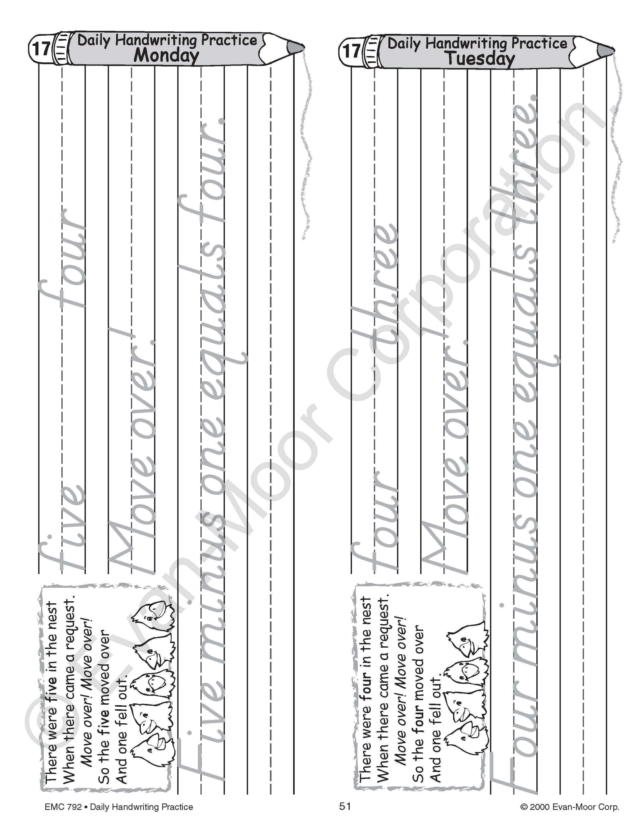 Monday through Thursday, the weekly subjects for writing exercises include nutrition, our solar system, pets, and vehicles. On Friday, a full-page exercise draws the topic to a close by reviewing what was learned earlier that week.