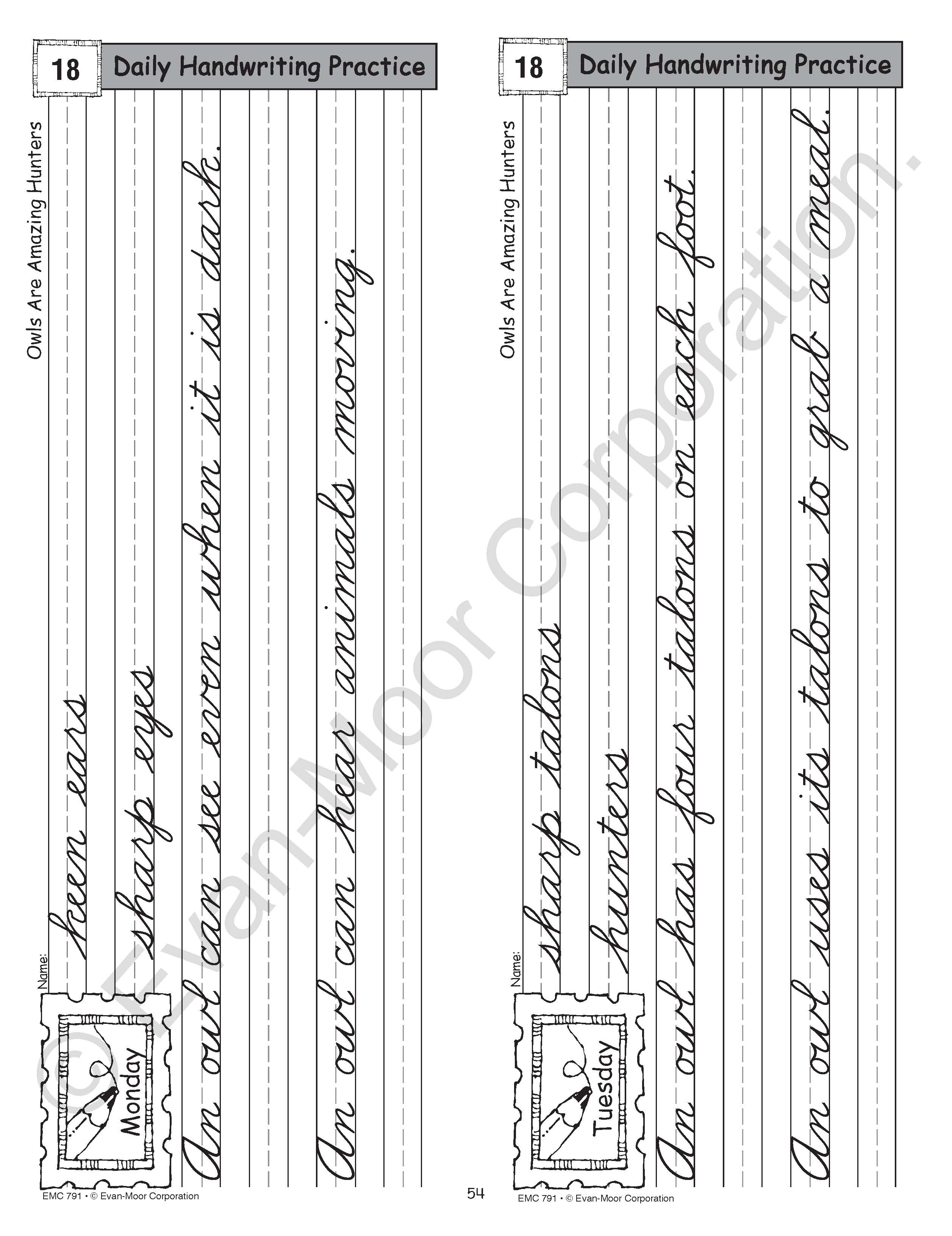 Monday through Thursday, the weekly subjects for writing exercises range from famous inventors to famous quotations and from amazing hunters to the water cycle. On Friday, a full-page exercise draws the topic to a close by reviewing what was learned earlier that week.