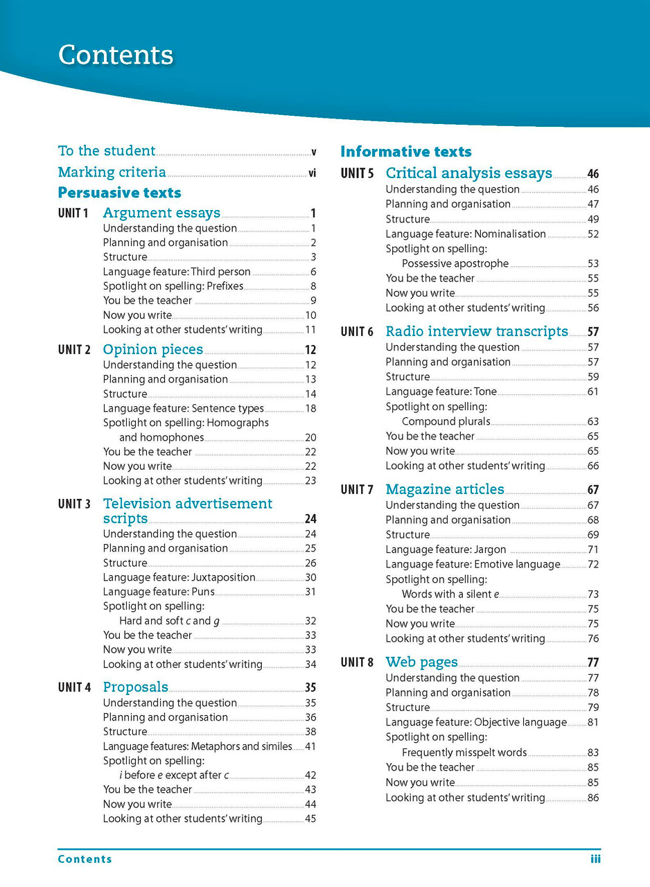 Each unit outlines the process of planning, drafting and writing a specific type of text, and then provides a sample text as a benchmark for students’ own writing.
