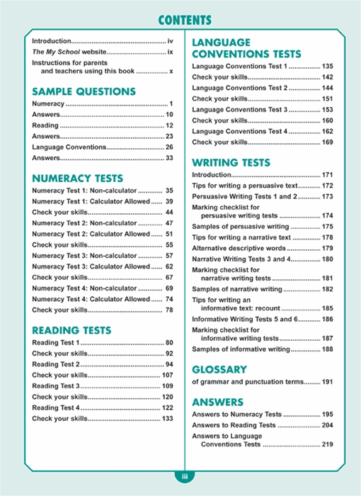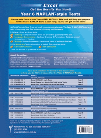 Excel Year 6 NAPLAN*-style Tests includes: Five practice tests each for numeracy, language conventions and reading. Six practice tests for writing plus model answers at basic, intermediate and advanced levels.