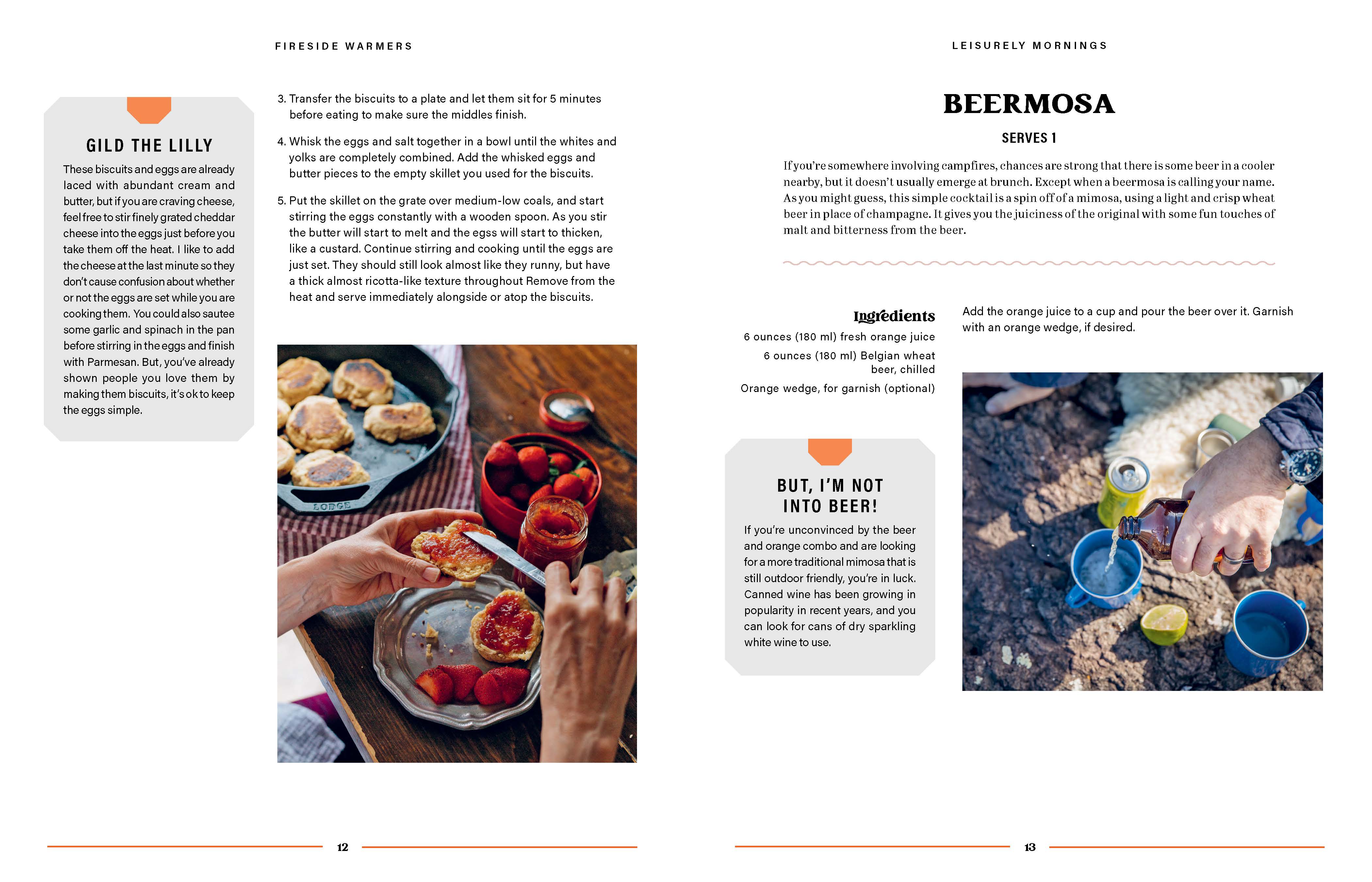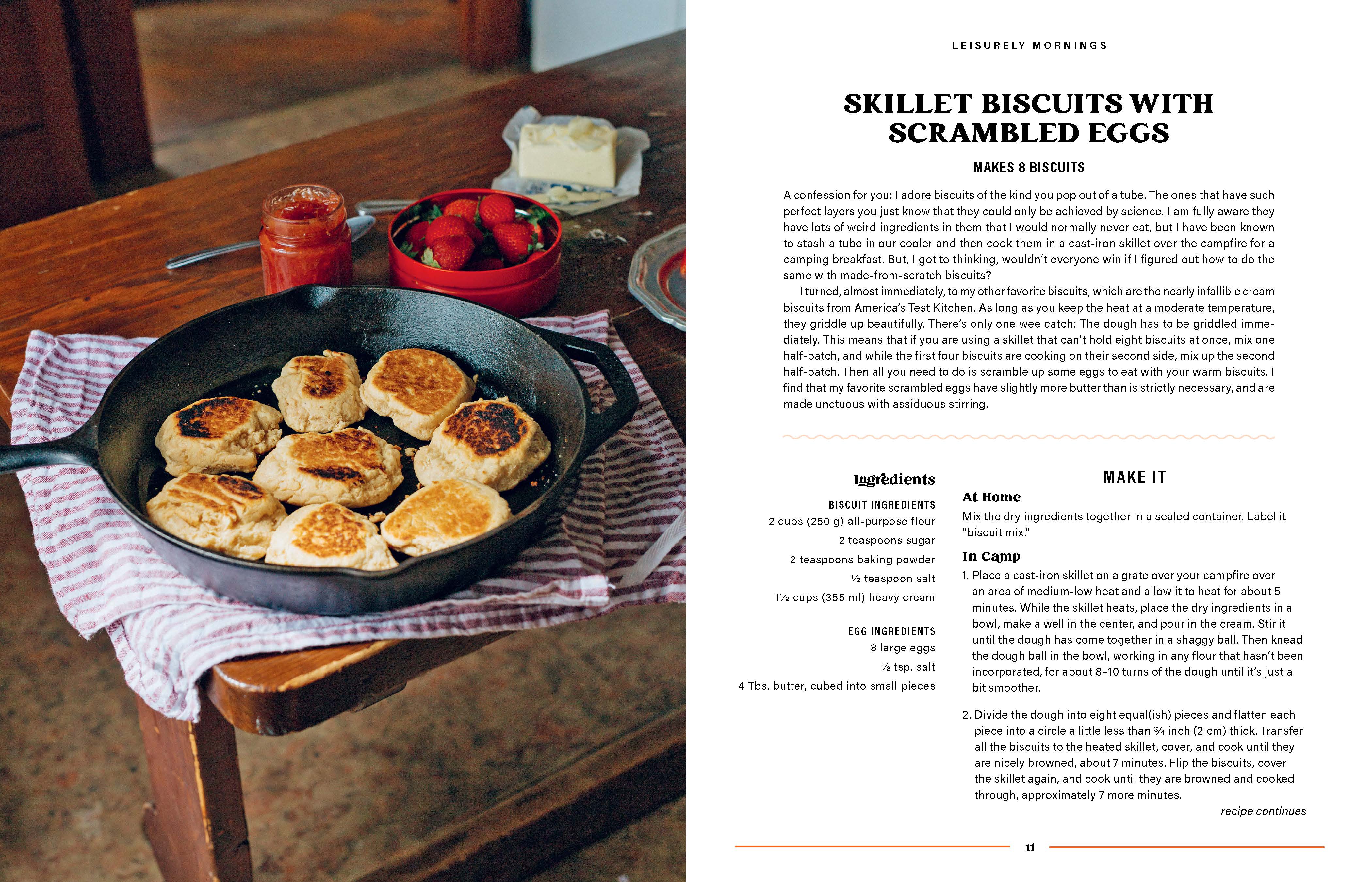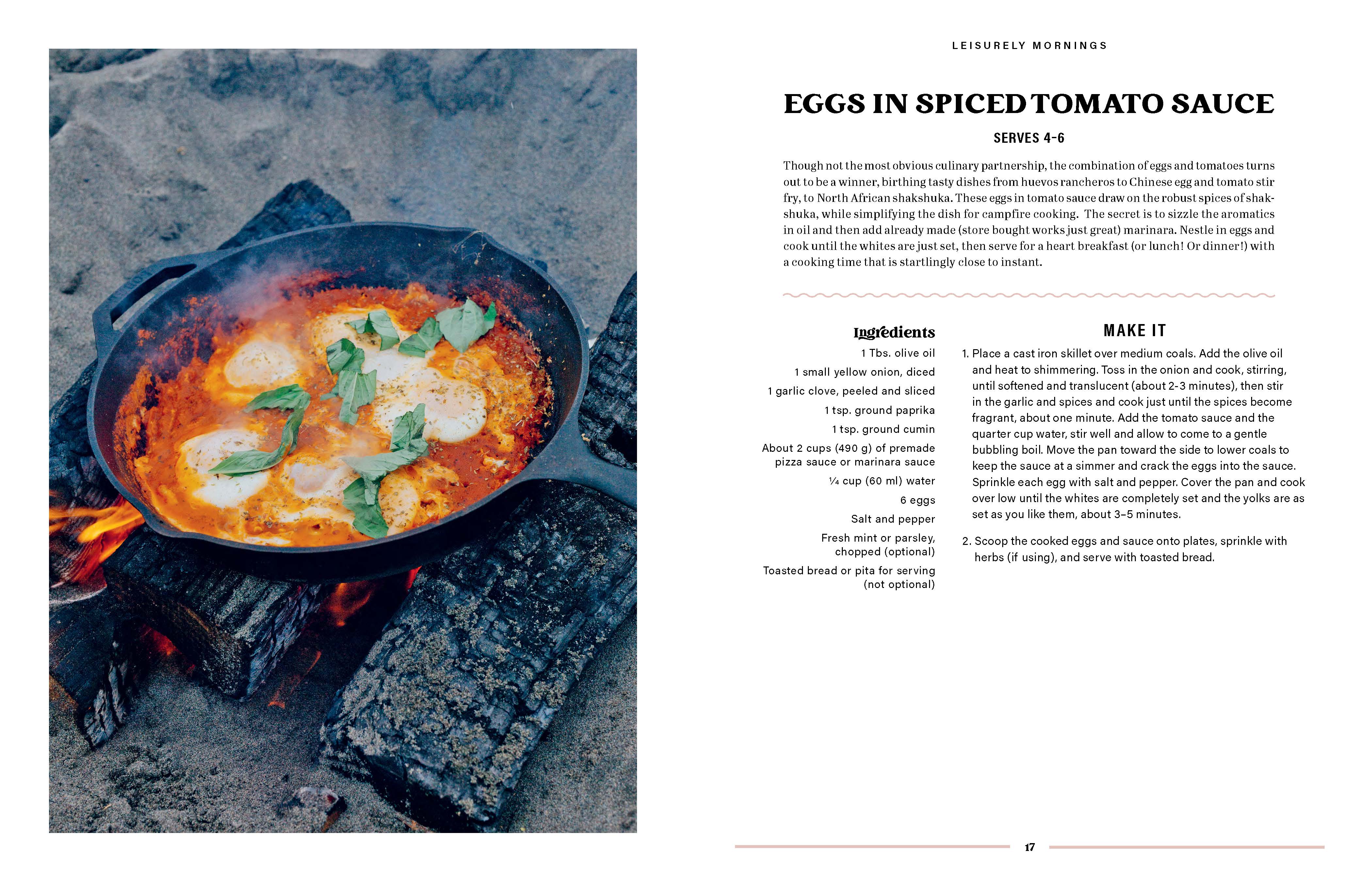 Leisurely Mornings: Rise and shine and pair that camp coffee or French press dirty chai with skillet biscuits and scrambled eggs, maple-chili glazed bacon, eggs in purgatory, fluffy fruit-filled pancakes, campfire French toast, or easy breakfast quesadillas. From sweet to savory and from spiked to sober, youre sure to find the perfect pairing for your next fireside gathering.