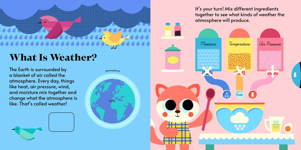 Don't just read about weather--make it move! In Hands-On Academy Weather, little hands will literally make rain fall, suns rise, and rainbows shine with wheels, tabs, flaps, and more made from sturdy, durable artcard, all while learning the fundamentals of weather. Bold, colorful art and simple vocabulary round out this first-of-its-kind, fully interactive STEAM book! A perfect addition to preschool shelves and early-learning programs, and a fun way to inspire STEAM (and answer tough questions!) at a time when inquisitive minds are beginning to blossom.