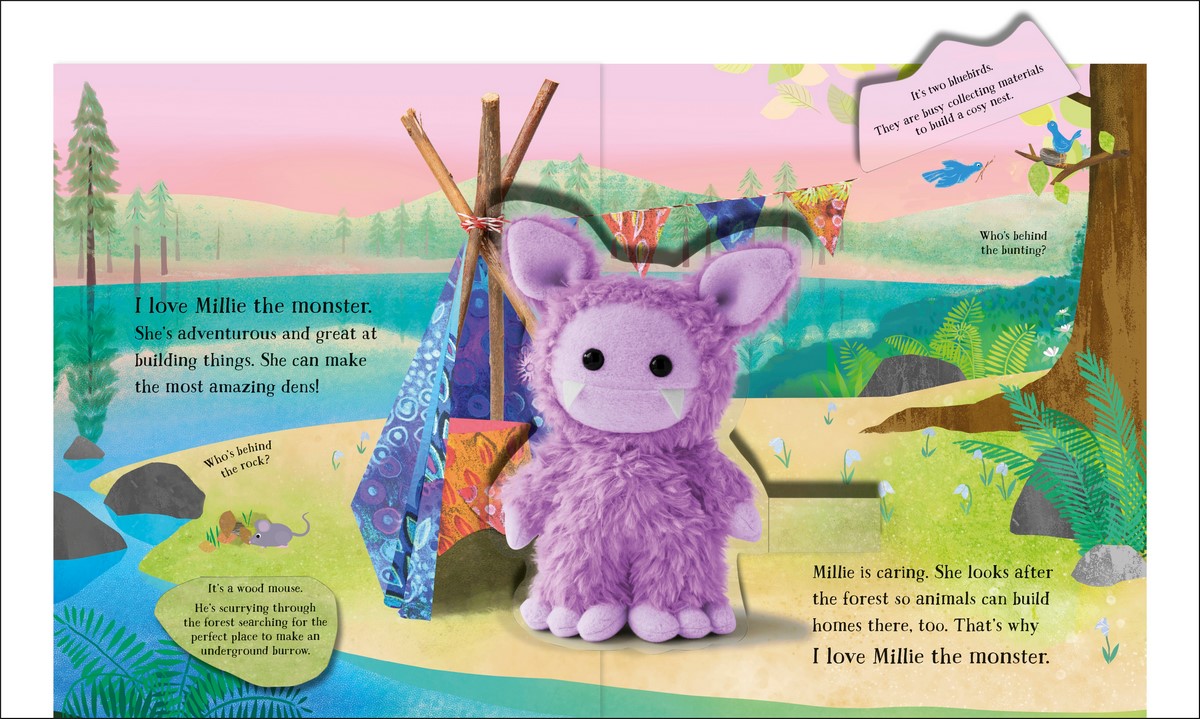 Watch Millie the monster show off her building skills and make a magnificent den in the forest, then take a peek behind the flaps to find out how her animal friends build cosy homes of their own. Meet Willow the monster as he faces his fear of the dark, learns about the moon, and discovers amazing animals that come awake at night. Follow the splish splash sounds to meet Thunder the monster jumping in muddy puddles, he's loud and lively and loves exploring the forest and finding out about the animals who live there.