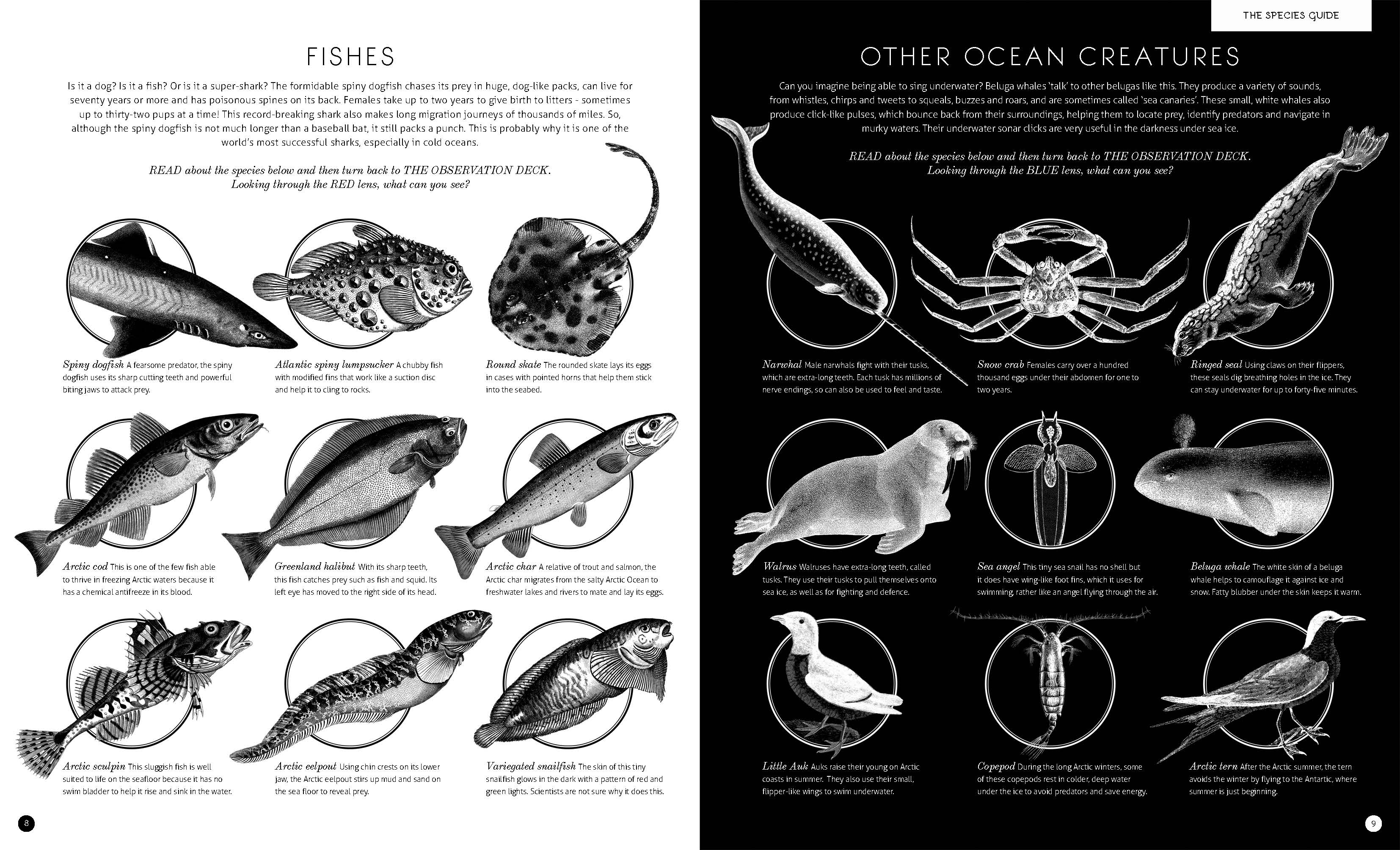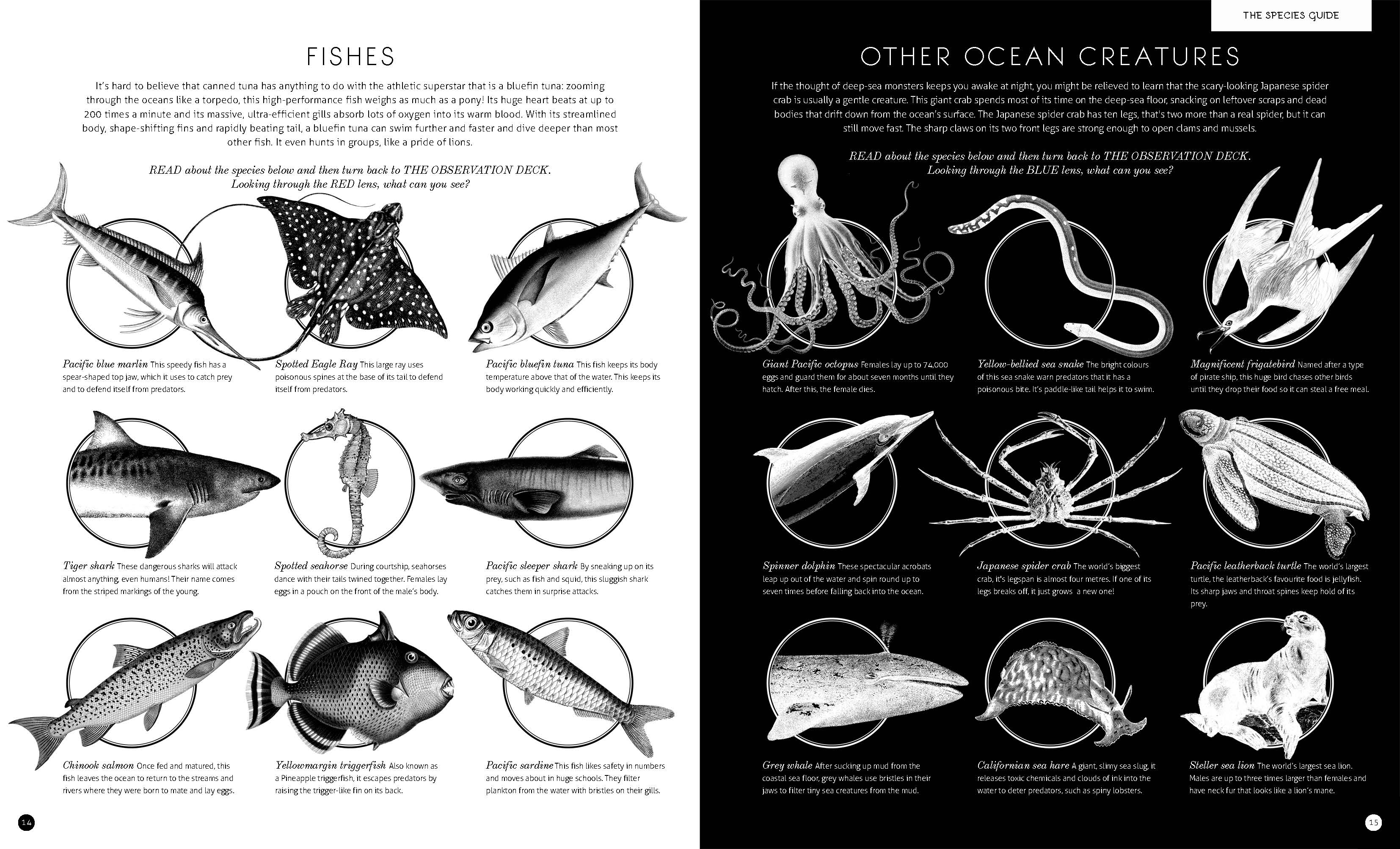 From the mighty Pacific to the polar seas, Illuminoceans takes readers on a journey of discovery through the most mysterious environments known to science. Meet majestic mammals like blue whales, orcas and dolphins, shoals of colourful fish, and whole oceans full of weird and wonderful reptiles, plants and tentacled titans. With your lens in hand, explore the worlds of wonder hidden just below the surface. Your blue lens will uncover the most unusual and important creatures from each habitat, from tiny sea slugs to giant squid, to extravagantly patterned tropical fish. Use your red lens to reveal the plants and other phenomena that make up so much of the underwater landscape, from plankton, to coral, and the strange relics and wrecks that make up part of our ocean world, reminding us of the human impact that we have had on the sea for thousands of years.