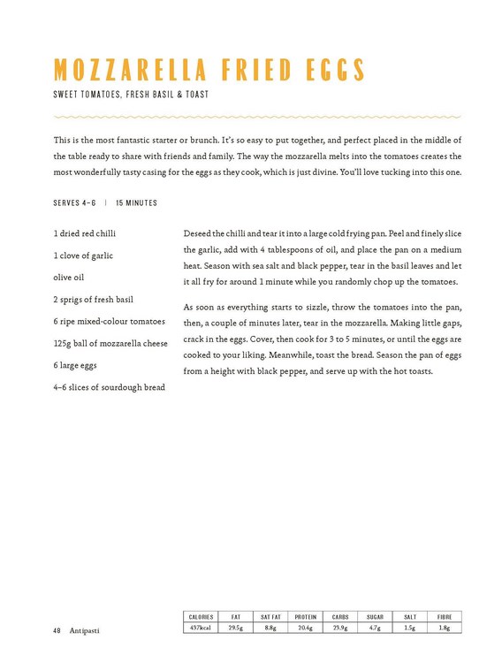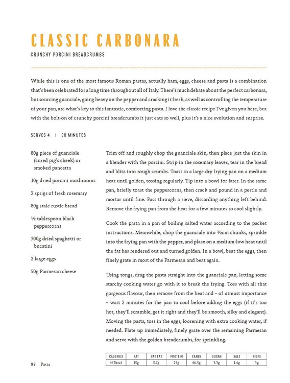 Featuring 130 recipes in Jamie's easy-to-follow style, the book has chapters on Antipasti, Salad, Soup, Meat, Pasta, Fish, Rice & Dumplings, Bread & Pastry, Sides, Desserts and all the Basics you need.