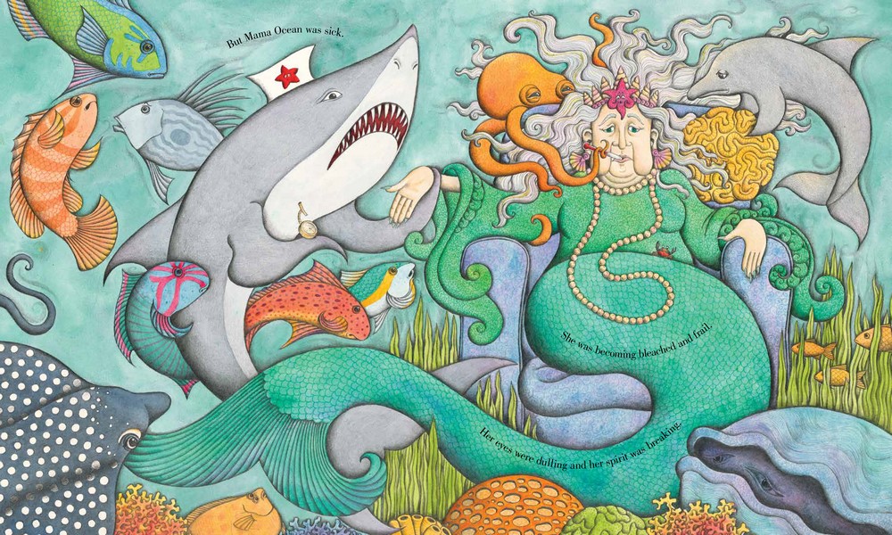 The alliteration, descriptive terms and short, snappy sentences enhance the visuals, the words literally bending and swirling among the striking pictures. The fluidity of the ocean is evoked with curling lines and watercolour, with bright oranges, yellows and reds that contrast with the emerald backdrop, which slowly greys as the rubbish thickens and Mama Ocean becomes more ill. This is an enlightening story with a strong environmental message about the impact of litter on our ocean’s ecosystem, encapsulated within a mesmerising visual presentation. Mama Ocean’s important message is conveyed with a charm and playfulness that will encourage sustainability practice in pre- and primary school children.' — Romi Sharp, Books+Publishing