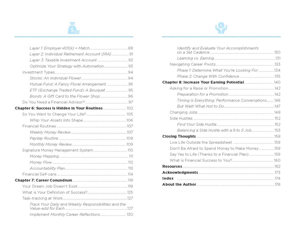 You'll find chapters that address:Budgeting: Don't make it a dreaded B-word! Learn about various strategies including 50/30/20, zero-based, and 3-bucket budgets. How to save: It's all about SMART (specific, measurable, achievable, relevant, and time-bound). How to spend money: That's right, a plan for spending is important too! With a quick analysis of values and priorities, you can spend without feeling guilt—yes, even on those fancy coffees. Investing: Learn the difference between 401ks and IRAs, investment types from index funds to target date funds, and relate it all back to core concepts in investing (like diversification).