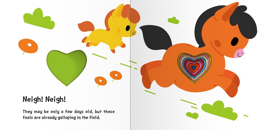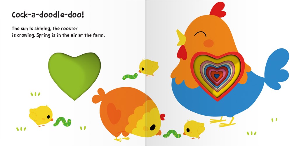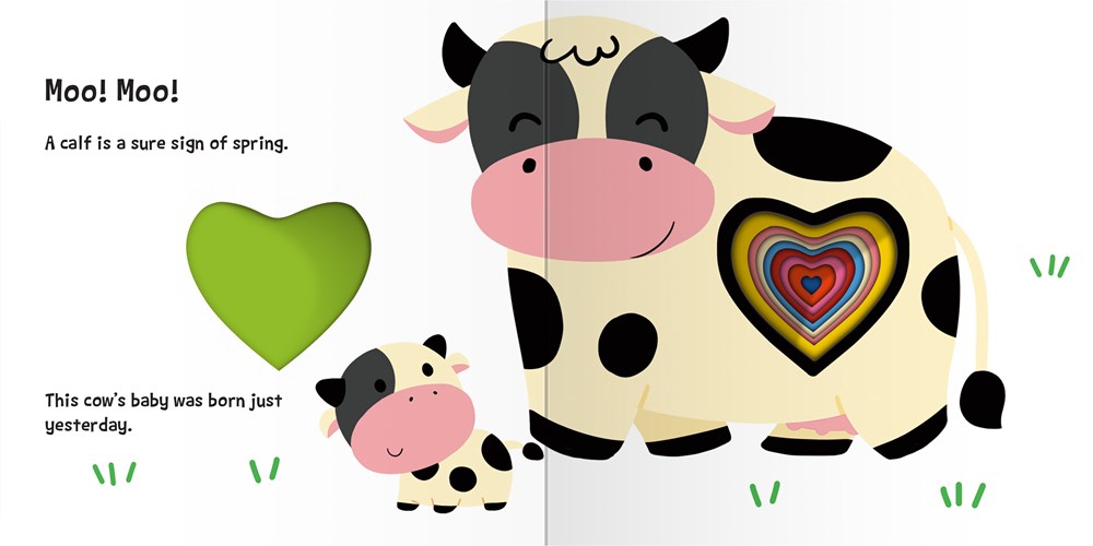 This book features bright illustrations and simple text that encourages children to identify farm animals and observe life on the farm from season to season: a baby calf and its mother in the spring, ducklings swimming in the pond in summer, a puppy in the orchard at harvest time, and a toad hibernating in the winter. Peep-Through ... The Farm is a perfect introduction to farm animals for curious babies!The book also features clever die-cuts for interactive fun; with each turn of the page, the cutout shape becomes slightly smaller, creating interesting layers for little fingers to explore.
