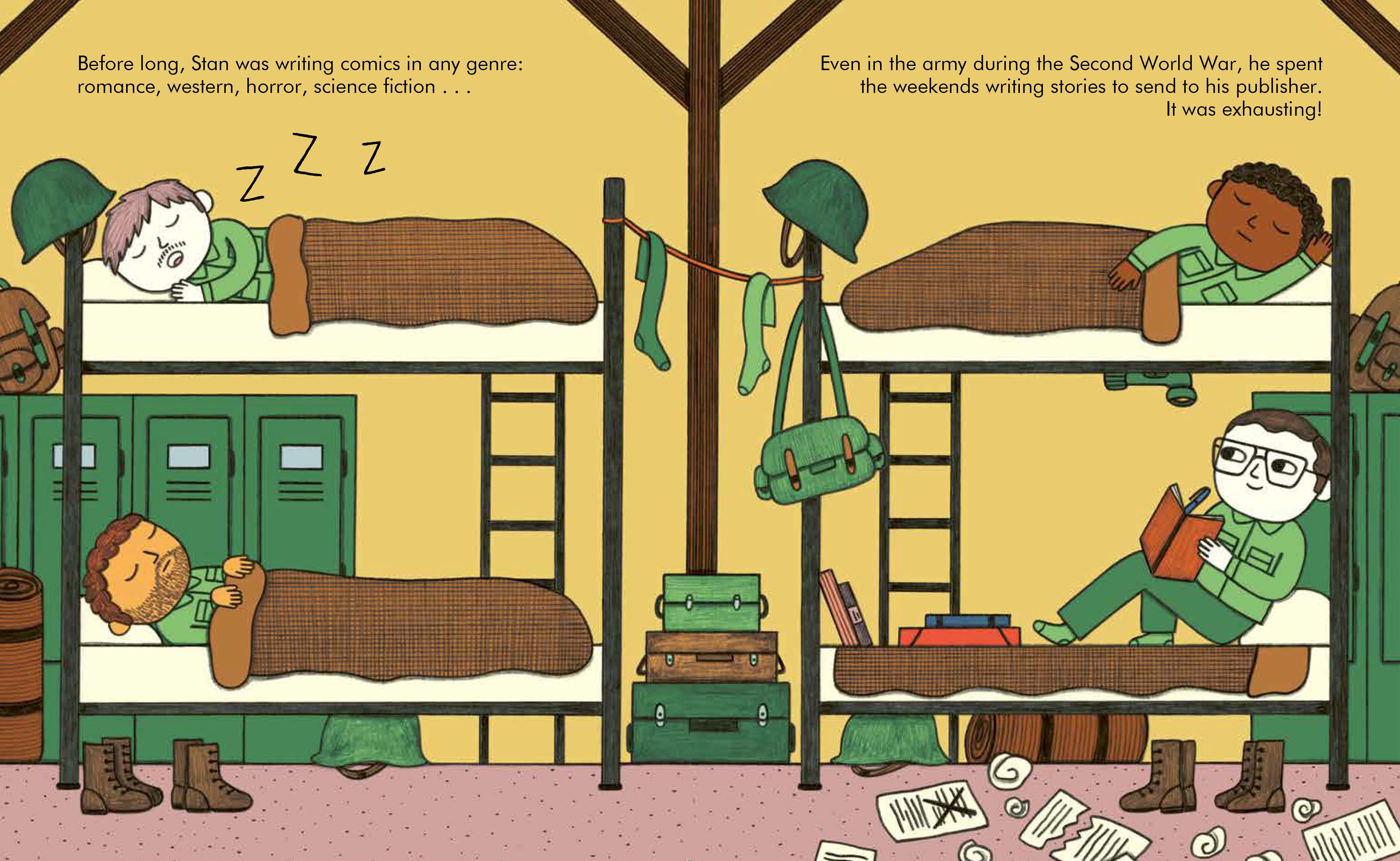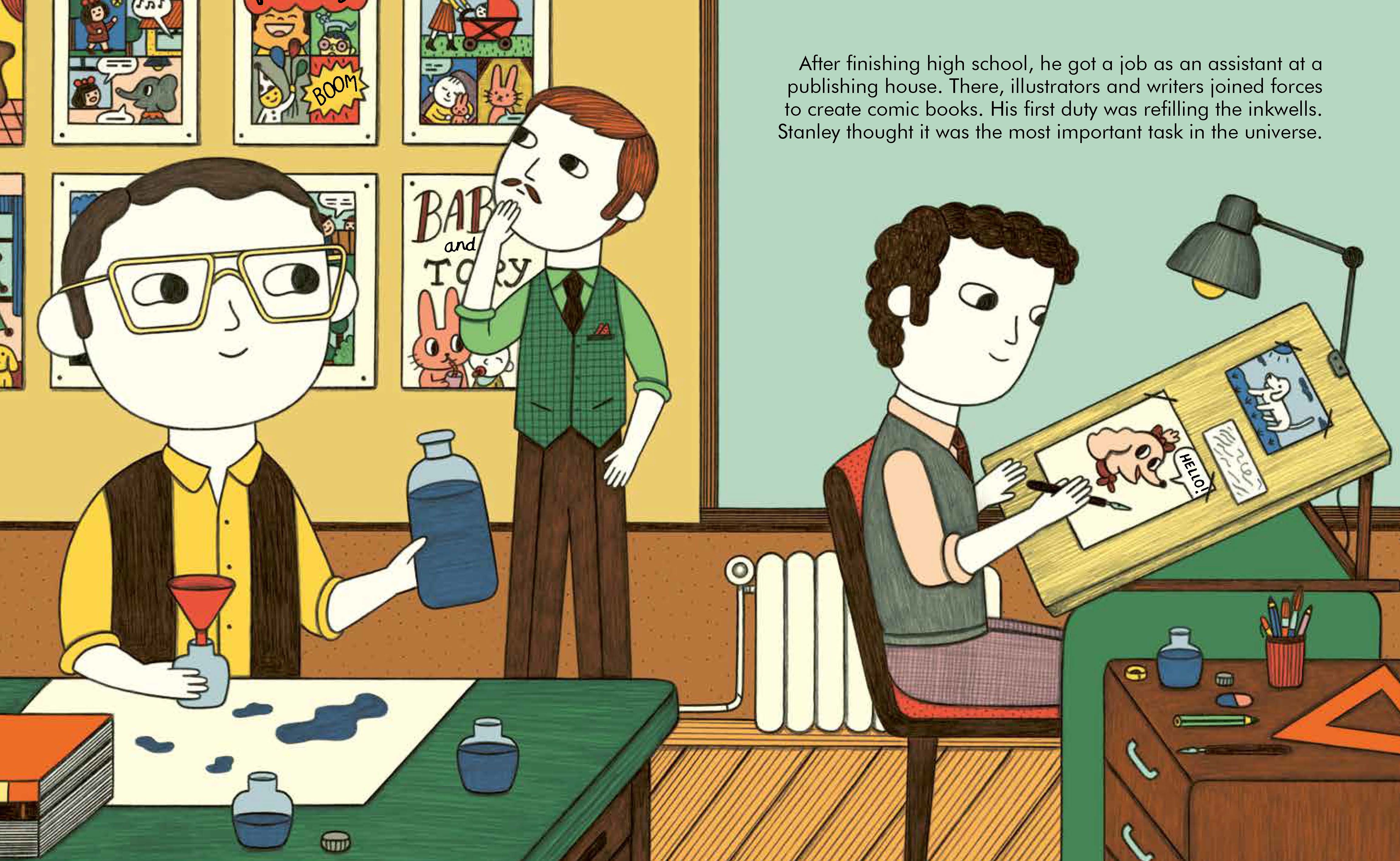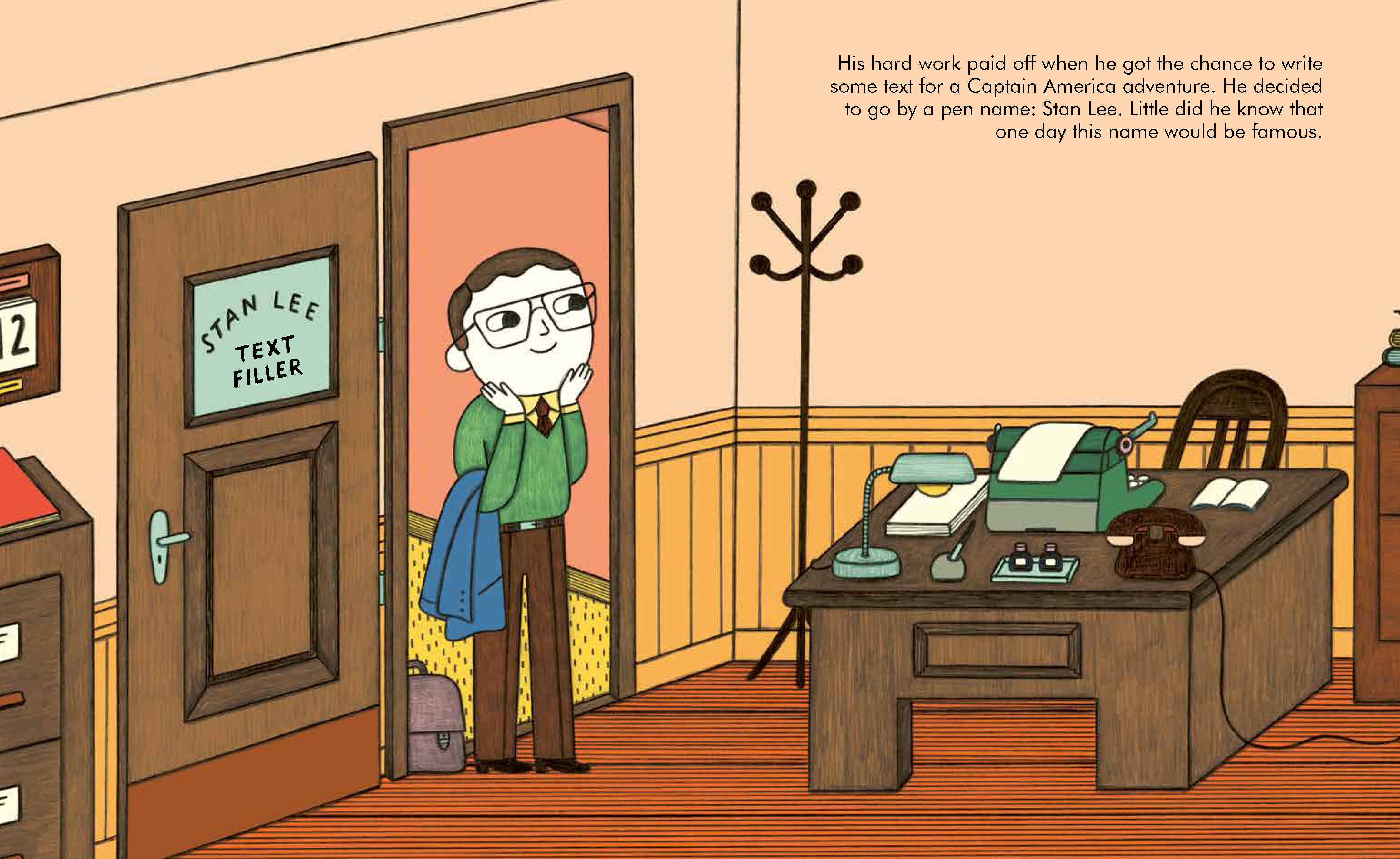 Be inspired by the amazing life of Stan Lee, the comic book genius who created Spider-Man, The Hulk and Iron Man! Little Stan grew up in New York City. As a child, he loved reading books, poems and newspaper strips. And when he didnt have his head in a book, he was writing stories of his own. After he graduated, Stan got his big break in the form of a job as an assistant at a small comic book publisher called Timely Comics.
