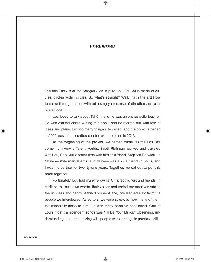 Lou Reed was a musician, singer, songwriter, poet, and founding member of the legendary rock band the Velvet Underground. He collaborated with many artists, from Andy Warhol and John Cale to Robert Wilson and Metallica. Reed had a groundbreaking solo career that spanned five decades until his death in 2013. Reed was also an accomplished martial artist whose practice began in the 1980s. He studied with Chen Tai Chi pioneer Master Ren GuangYi. This book is a comprehensive collection of Reed's writings on Tai Chi.