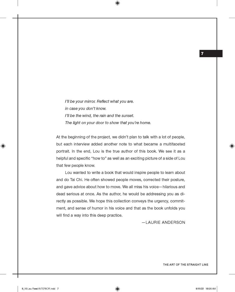 It includes conversations with Reed's fellow musicians, artists, friends, and Tai Chi practitioners, including Julian Schnabel, A.M. Homes, Hal Willner, Mingyur Rinpoche, Eddie Stern, Tony Visconti, and Iggy Pop. The Art of the Straight Line features Reed's unpublished writings on the technique, practice, and purpose of martial arts, as well as essays, observations, and riffs on meditation and life.