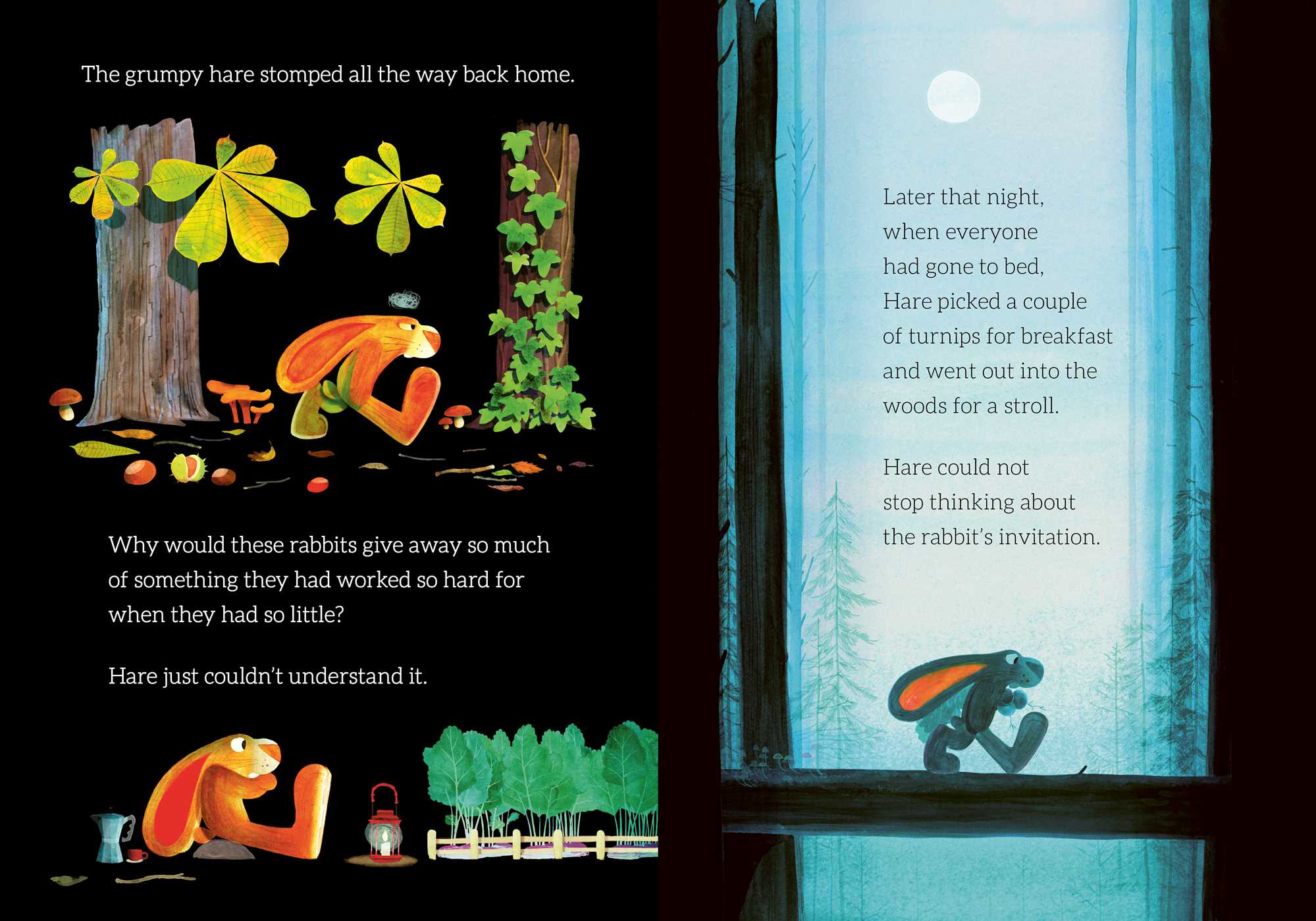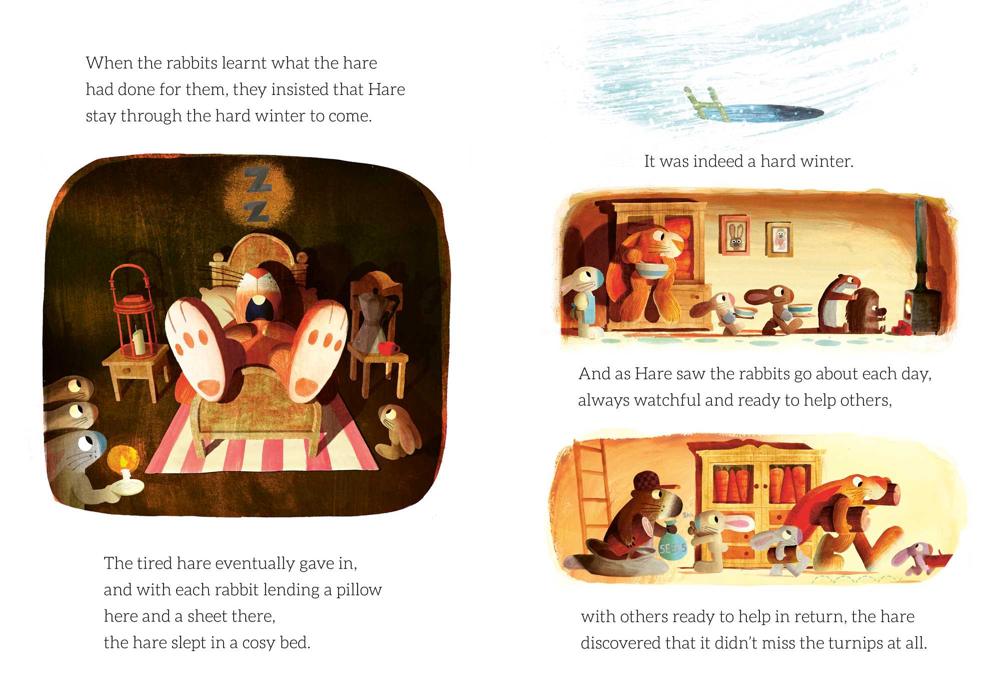 The more I give away the less there is for ME. But even the hare can appreciate the lovingly tended carrot patch created by the neighbouring rabbits. So, when a huge boar threatens to destroy the patch, will this hare come to see that