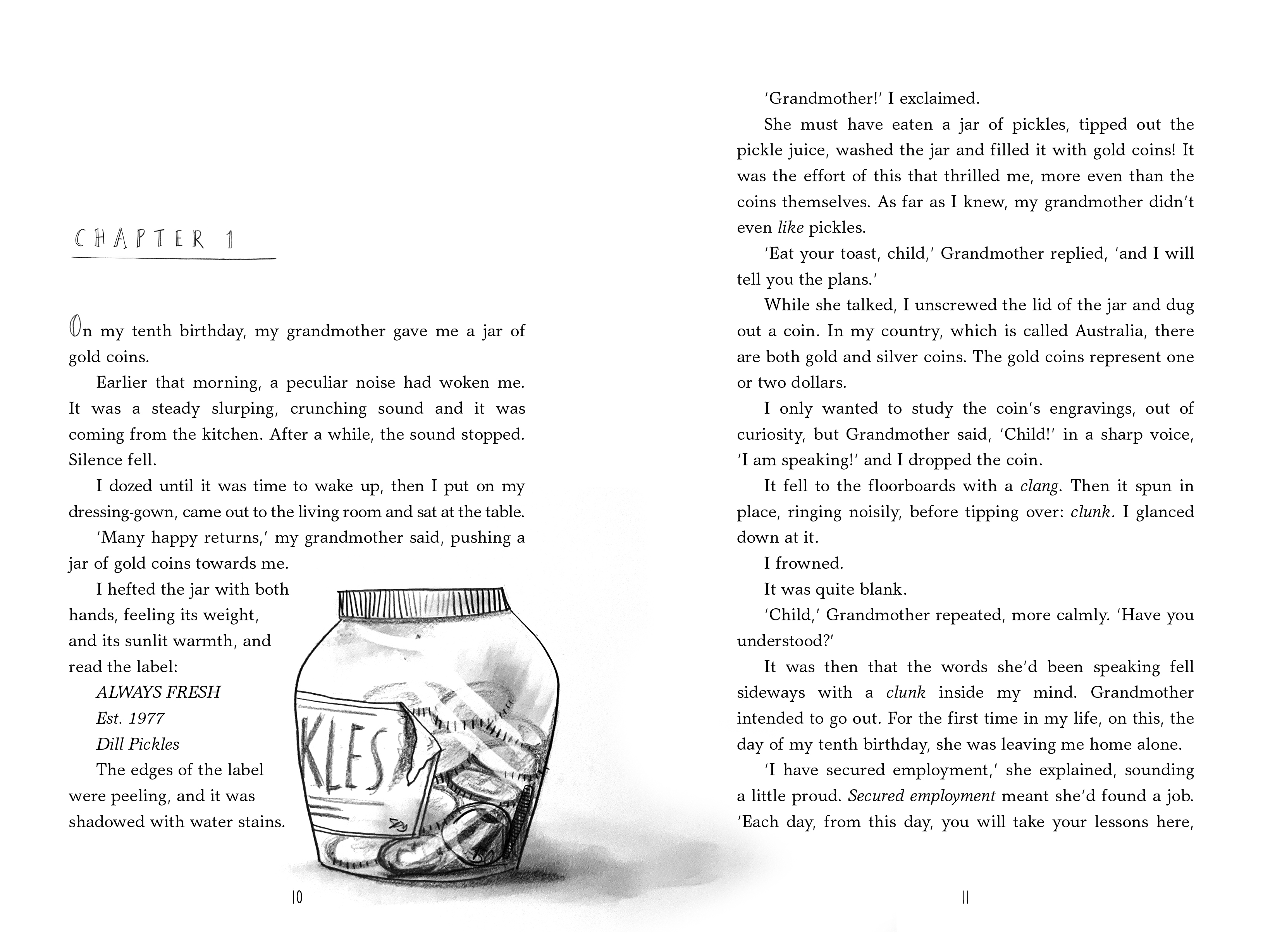 Lillian Velvet lives a very lonely life with her cold and remote Grandmother. That is, until her tenth birthday, when she is given a pickle jar of gold coins, along with a note with clear instructions: don't go out, don't open the door for anyone, and don't spend all your coins in one day.