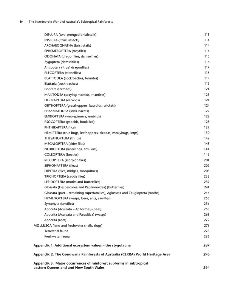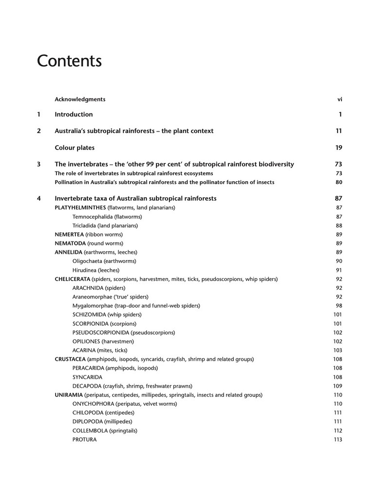 The Invertebrate World of Australia's Subtropical Rainforests is a comprehensive review of Australia's Gondwanan rainforest invertebrate fauna, covering its taxonomy, distribution, biogeography, fossil history, plant community and insect–plant relationships. This is the first work to document the invertebrate diversity of this biologically important region, as well as explain the uniqueness and importance of the organisms.