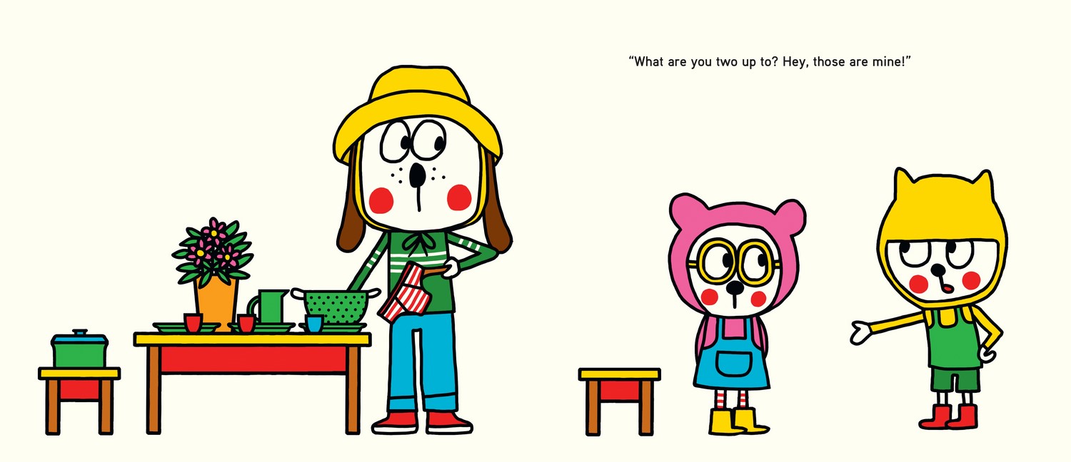This morning, Fodo Dodo and Noodle go fishing. They take raincoats, boots, hats and a fishing rod. From their bathtub boat, they soon catch a beautiful striped fish out of the laundry basket—underguppies!